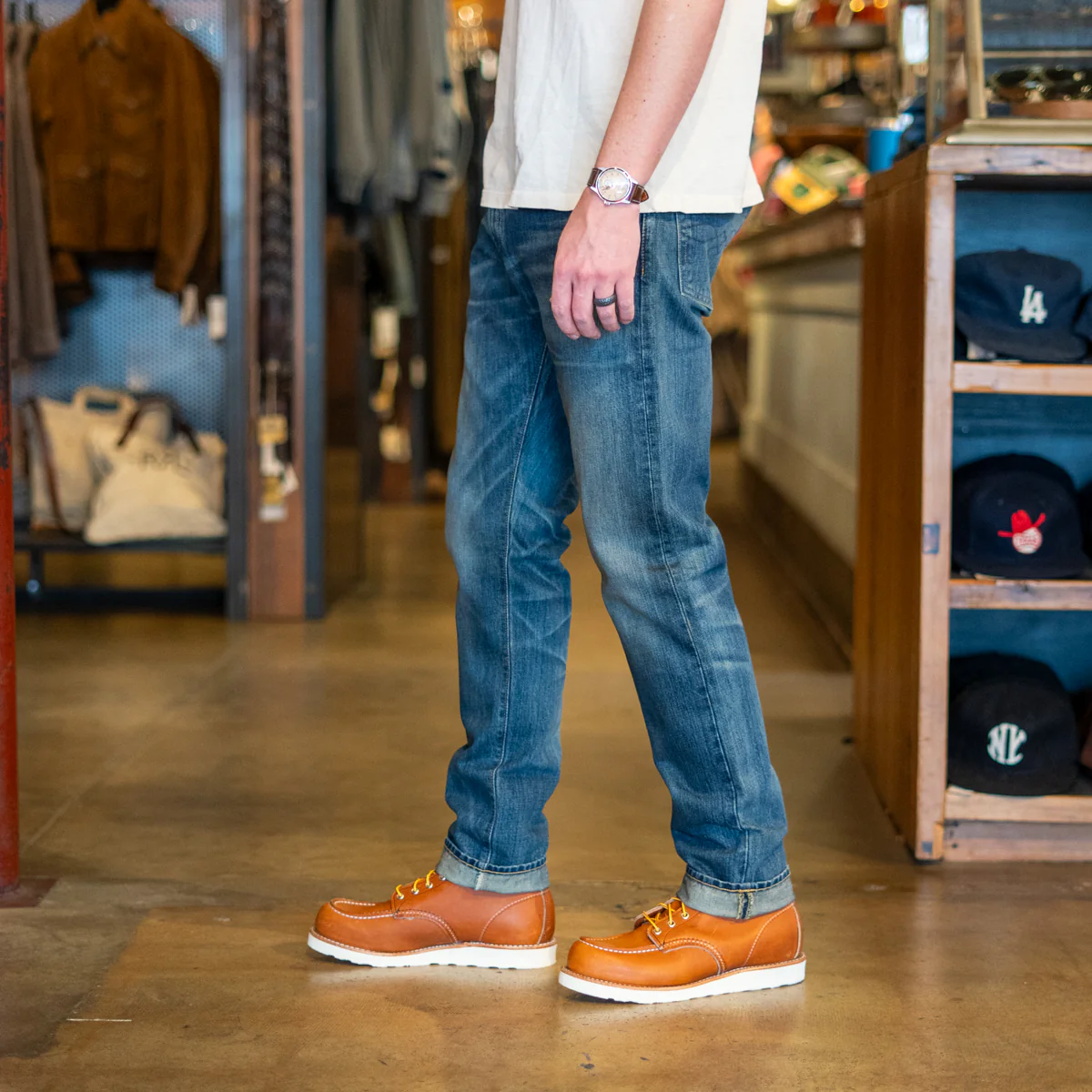 - Slim fit through the seat, thigh, & leg